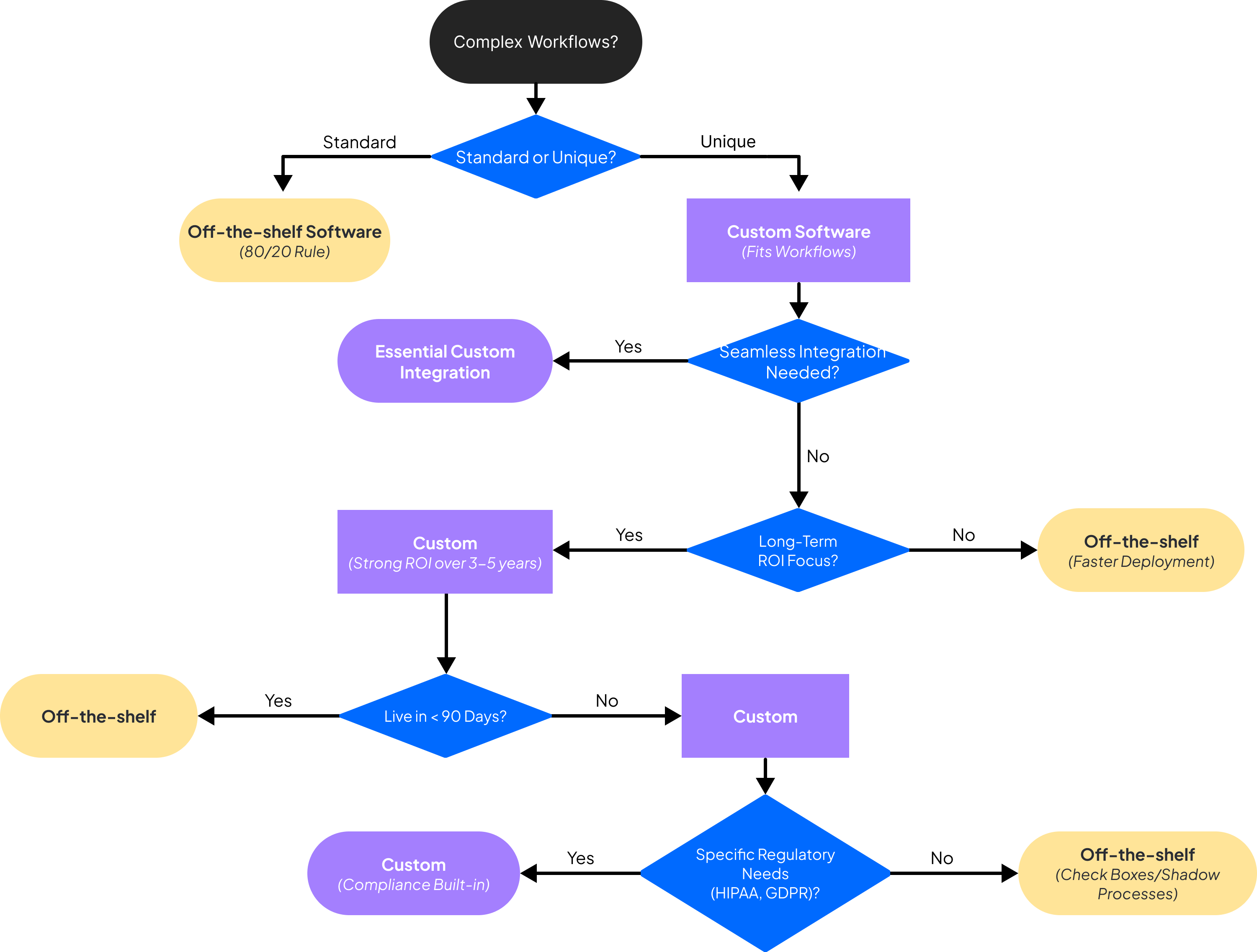 Off-the-shelf software brings another set of compromises. It’s faster to deploy, but rarely fits perfectly. Limited customization can force your teams to adjust workflows rather than the software adapting to them, which can create inefficiencies or workarounds. Feature gaps or integration limitations with EHRs, labs, billing, or telehealth systems can add hidden costs or complexity. Vendor dependency also poses risk: changes in pricing, feature roadmaps, or product discontinuation can disrupt operations and force unexpected adjustments.
