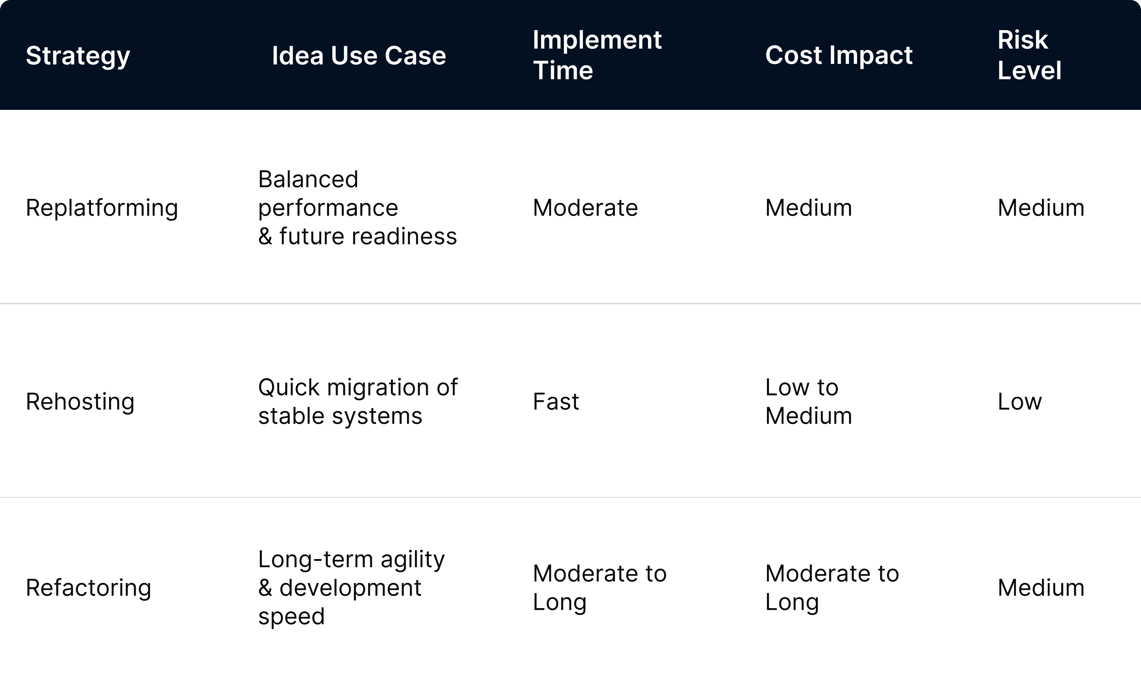 - Speed and simplicity: By keeping the app code unchanged, rehosting minimizes migration timelines and reduces the need for major rework.